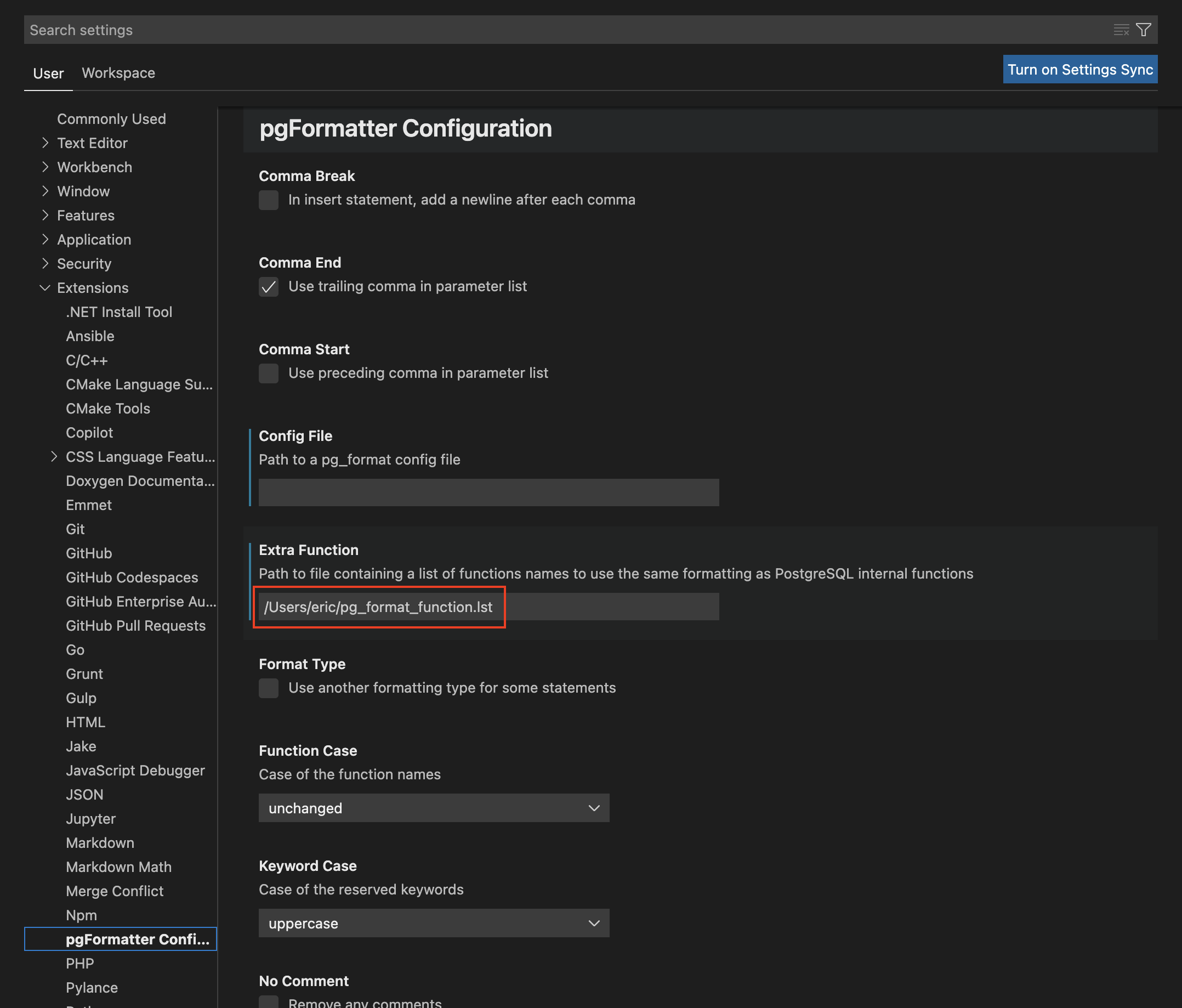 Using sqlc.narg conflicted with VSCode pgFormatter auto formatter, with it being interpreted as a token instead of a function. If you’re using sqlc.narg while still wanting to use pgFormatter, create a new line delimited file list of sqlc.arg and sql.narg. Then set that file’s path under “Extra functions”.